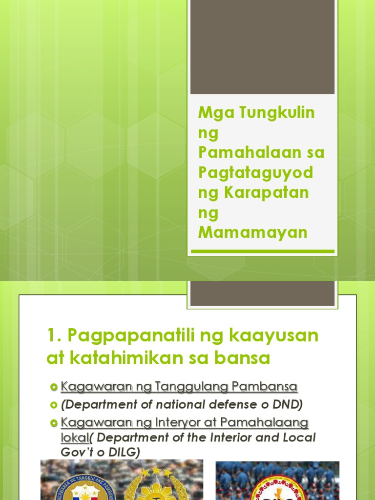 Ipaliwanag ang bahaging ginagampanan ng pamilihan sa sambahayan at bahay kalakal. Currently it includes the secretaries of 21 executive departments and the heads of other several other minor agencies and offices that are subordinate to the president. Kagawaran ng Repormang Pansakahan.