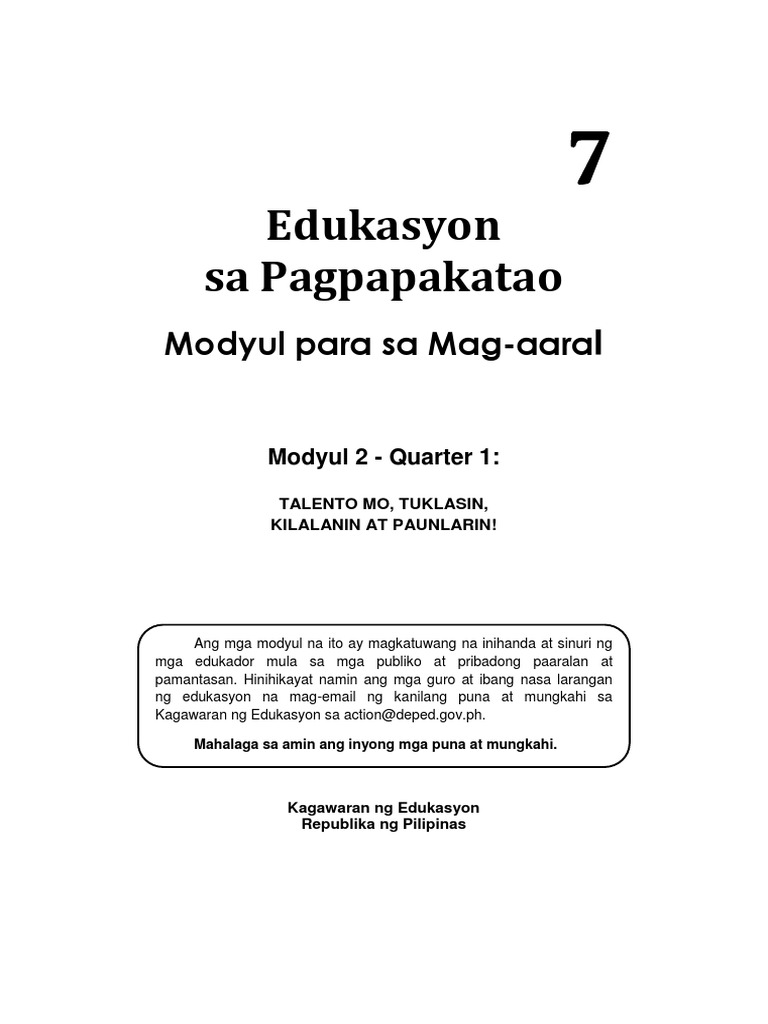 1 Edukasyon sa Pagpapakatao Modyul para sa Mag-aaral Yunit 1 Ang aklat na ito ay magkatuwang na inihanda at sinuri ng mga edukador mula sa mga publiko at pribadong paaralan at pamantasan. Hello again guys D for todays video were going to do another activity but this time in EsPAlso enjoy my inteo D. Impossible Pamilyar ba sa iyo ang mga katagang ito.