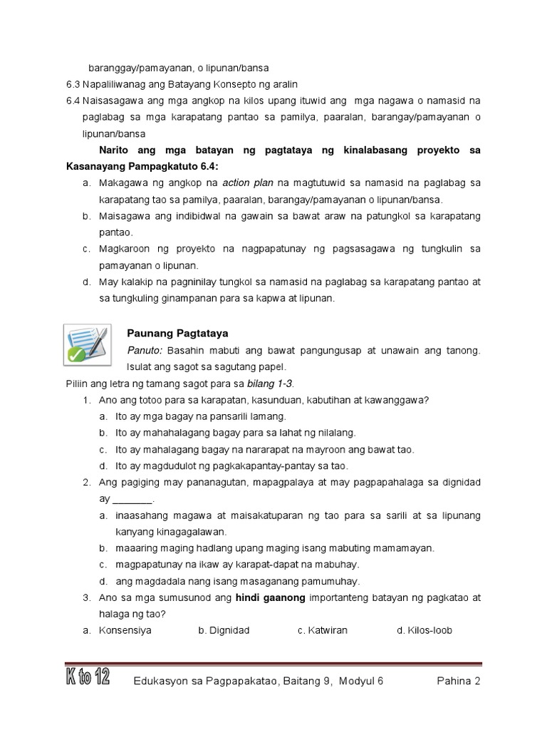Ang KARAPATAN ang kapangyarihang MORAL na gawin hawakan pakinabangan at angkinin ang mga bagay na kailangan ng tao sa kanyang estado sa buhay. PERFORMANCE TASK Week 1 2 1 st QUARTER SCIENCE GRADE 9. Start studying ESP 9 - Module 6.